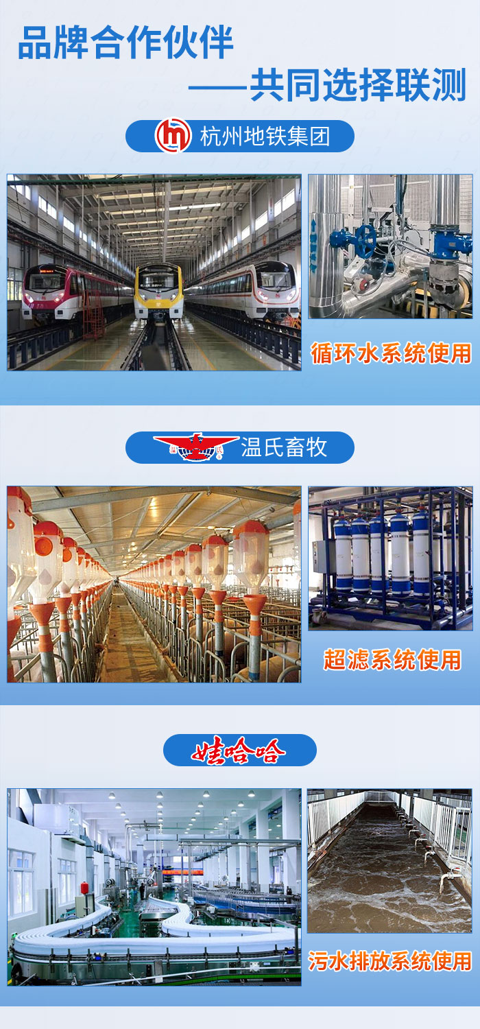 近年來,聯(lián)測儀表廣泛應(yīng)用于各大領(lǐng)域,與國內(nèi)品牌杭州地鐵集團(tuán)、溫氏畜牧、娃哈哈......達(dá)成合作,專業(yè)的技術(shù),敬業(yè)的服務(wù)贏得了諸多企業(yè)的信賴與支持。本次合作也給客戶留下了良好的印象,好評連連,溫州繞城高速公路有限公司表示,后續(xù)多個站點會批量使用我司電磁流量計。